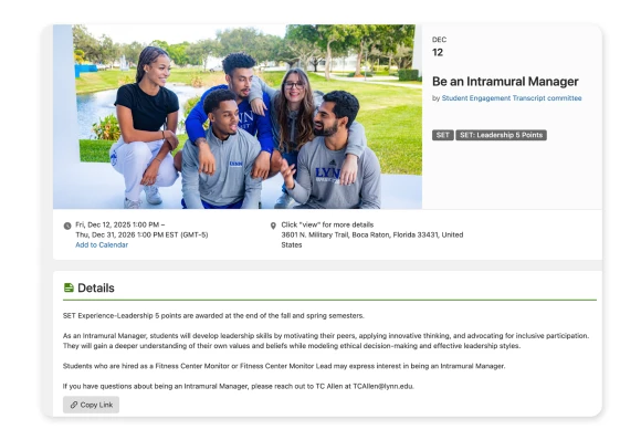 Like many institutions nationwide, Lynn identified financial stress, rising costs, and time constraints as major barriers to student participation in co-curricular activities. At the same time, research consistently links engagement and belonging to academic success and persistence. Students who participate in extracurricular activities are more likely to feel connected, build leadership and communication skills, and clarify career goals.